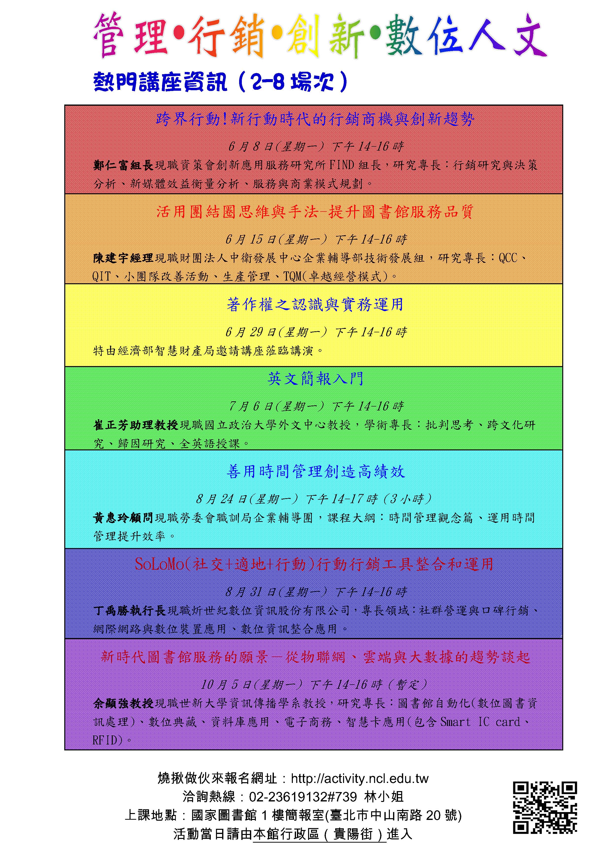 國家圖書館6-10月辦理「管理•行銷•創新•數位人文」主軸訓練課程2-8場次活動,敬邀圖書館界同道踴躍參加。 國家圖書館104年以「管理•行銷•創新•數位人文」為主軸,為館員專業成長及服務知能的提升規劃講座,特於6月8日至10月5日(週一)下午於本館1樓簡報室辦理第2-8場次教育訓練。 1.各場次辦理時間、講題以及主講人資訊如下: (1)第2場次-6月8日下午14-16時「跨界行動!新行動時代的行銷商機與創新趨勢」:鄭仁富組長(資策會創新應用服務研究所FIND組長) (2)第3場次-6月15日下午14-16時「活用團結圈思維與手法-提升圖書館服務品質」:陳建宇經理(財團法人中衛發展中心企業輔導部技術發展組) (3)第4場次-6月29日下午14-16時「著作權之認識與實務運用」 (4)第5場次-7月6日下午14-16時「英文簡報入門」:崔正芳助理教授(國立政治大學外文中心) (5)第6場次-8月24日下午14-17時「善用時間管理創造高績效」:黃惠玲顧問(勞委會職訓局企業輔導團) (6)第7場次-8月31日下午14-16時「SoLoMo(社交+適地+行動)行動行銷工具整合和運用」:丁禹勝執行長(炘世紀數位資訊股份有限公司) (7)第8場次-10月5日下午14-16時(暫定)「新時代圖書館服務的願景-從物聯網、雲端與大數據的趨勢談起」:余顯強教授(世新大學資訊傳播學系) 2.報名方式:線上報名 http://activity.ncl.edu.tw;即日起開始報名; 3.參與對象:圖書館界同道 如有相關問題,歡迎逕洽林小姐(電話:02-2361-9132分機739,電子郵件:yishin@ncl.edu.tw 詳細課程資訊請參考附件「104年6-10月教育訓練邀請老師及簡介資料(含講座簡介)」、海報 |